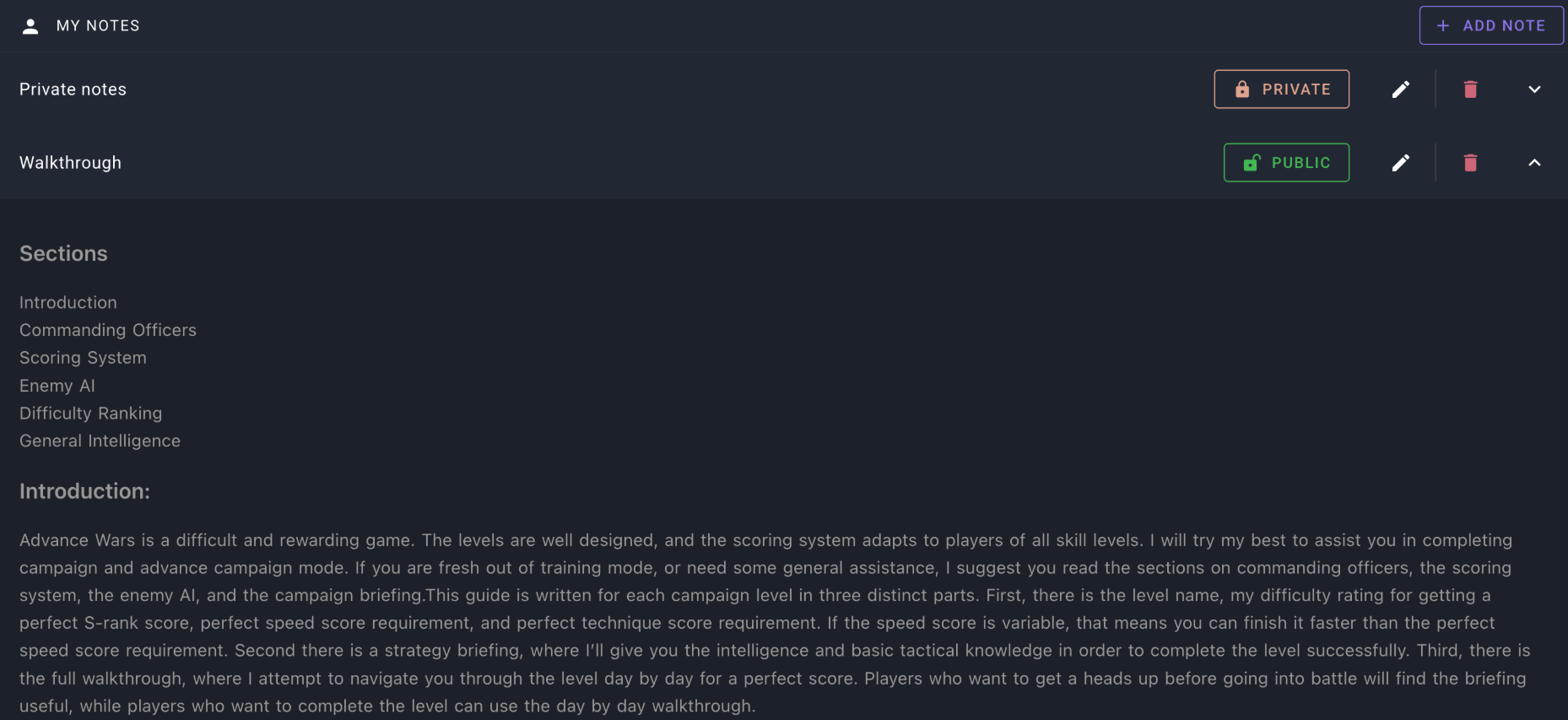 Public and private notes are supported, allowing players to store their own notes about their personal playthroughs, while making other notes available for all users of their instance - like walkthroughs, reviews and the like.